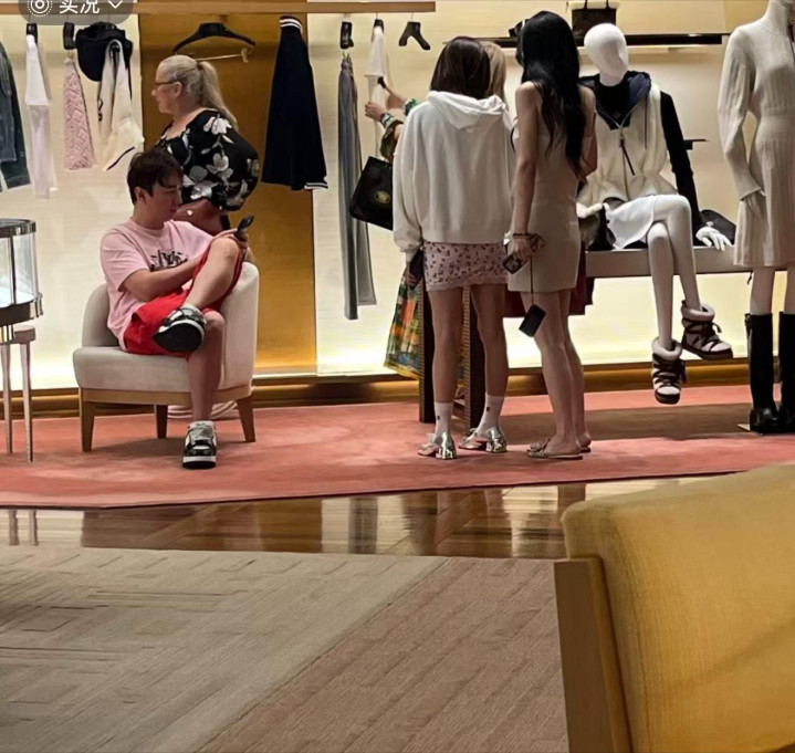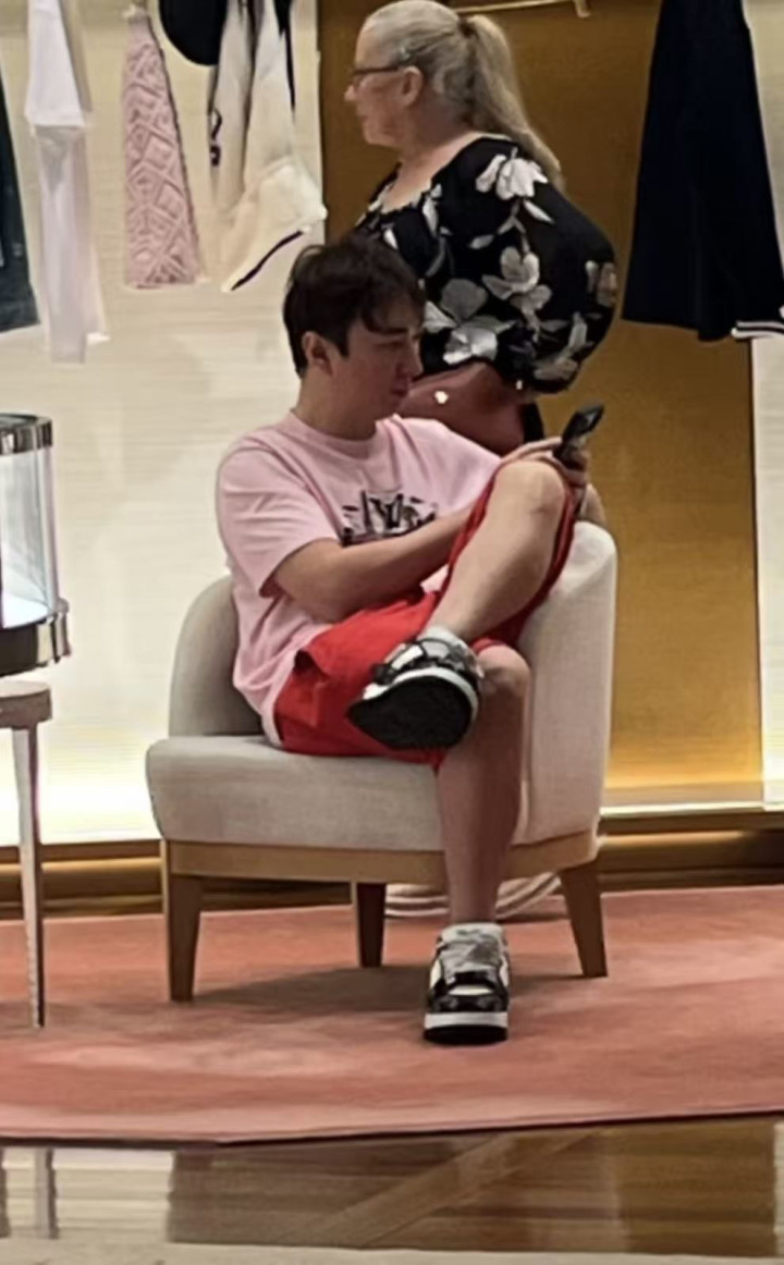 只见当天,王思聪穿了件粉色短袖,搭配红色短裤,套了双某大牌板鞋,很休闲,很随意。坐在椅子上的王思聪翘着二郎腿,不停地刷着手机,完全不关心女伴们挑选什么样的包包、价格等等。