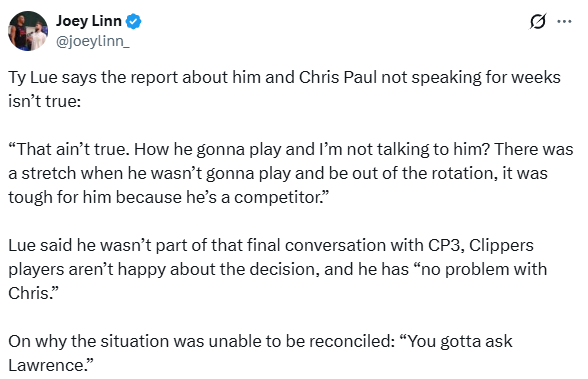 谈到与保罗几周没说话的报道,泰伦-卢公开否认此事,他表示:这不是真的。他要上场打球,我怎么可能不跟他沟通?有一段时间他确实不会登场,也不在轮换阵容中,这对他来说很难接受 —— 毕竟他是个天生的竞争者。