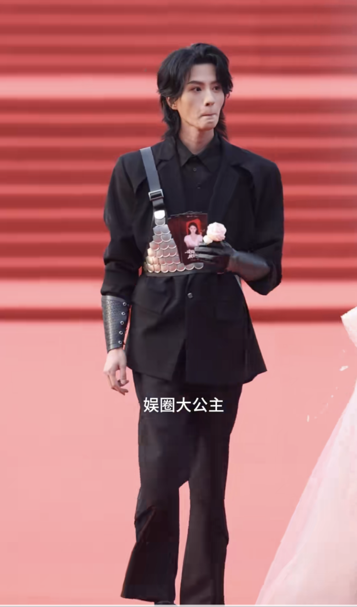 红毯上,做了狼尾造型,穿了一身黑西装,可身板太弱瘦了,裤子里的腿晃晃荡荡,跟两根筷子似的,让裤子一点包裹感都没有。