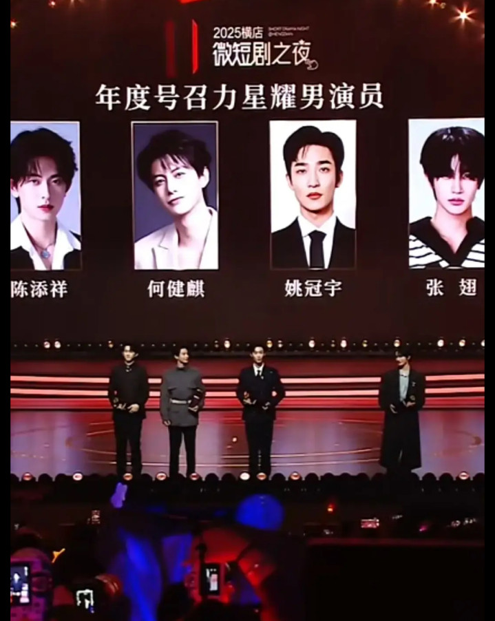另一场横店文荣奖举办的“微短剧之夜”玩得更大,开场就请了几十号短剧男主跳扫腿舞,放眼望去,不是黑皮衣就是白西装,个个180+,大长腿,养眼得很。