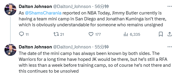 勇士记者Dalton Johnson报道,巴特勒在圣迭戈举办勇士迷你训练营,但库明加因仍在寻求一份新合同而未随队参加,迷你训练营的日期双方都早已知晓,勇士队一直希望库明加能够参加,但这位受限制自由球员在距离训练营开始不足一周仍未签约,他缺席活动是可以理解的,他与球队的闹剧也持续悬而未决。