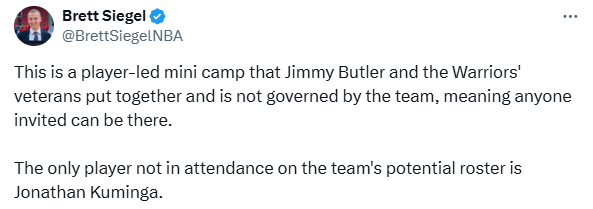 美记者Brett Siegel进一步报道,勇士圣迭戈训练营是由吉米-巴特勒和勇士老将们组织的球员主导型迷你训练营,并不受球队管理,也就是说任何被邀请的人都可以参加;球队潜在名单中唯一缺席的球员是乔纳森-库明加。