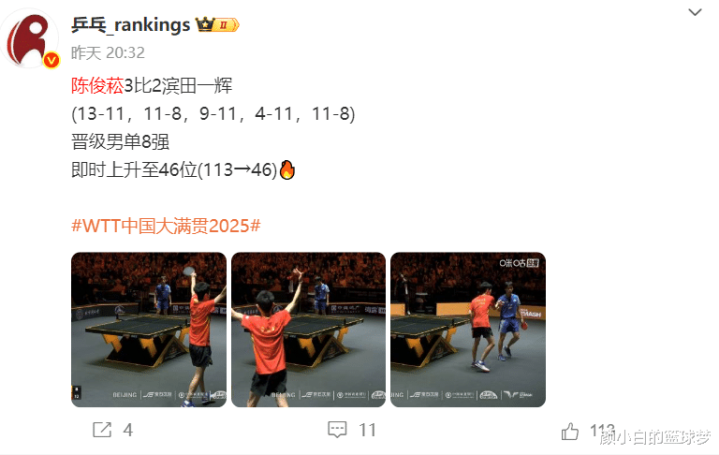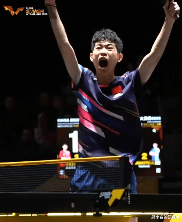 在32强赛上,名不见经传的陈俊菘淘汰了日乒一哥(世界排名第四)的张本智和,那场比赛陈俊菘3-2险胜,五局比分8-11,12-10,11-8,8-11,11-9,拿下胜利的陈俊菘是振臂高呼,这位从资格赛打拼上来的超级黑马首战即巅峰!