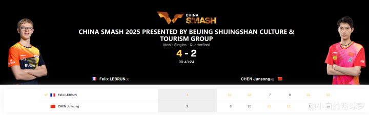北京时间10月3日,WTT北京大满贯男单1/4决赛,陈俊菘2-4不敌小勒布伦无缘四强,六局比分:6-11,10-12,11-7,11-9,5-11,10-12。这场比赛还是奥运会铜牌+7号种子的小勒布伦更胜一筹,但陈俊菘在本届大会上已经是一个赢家。
