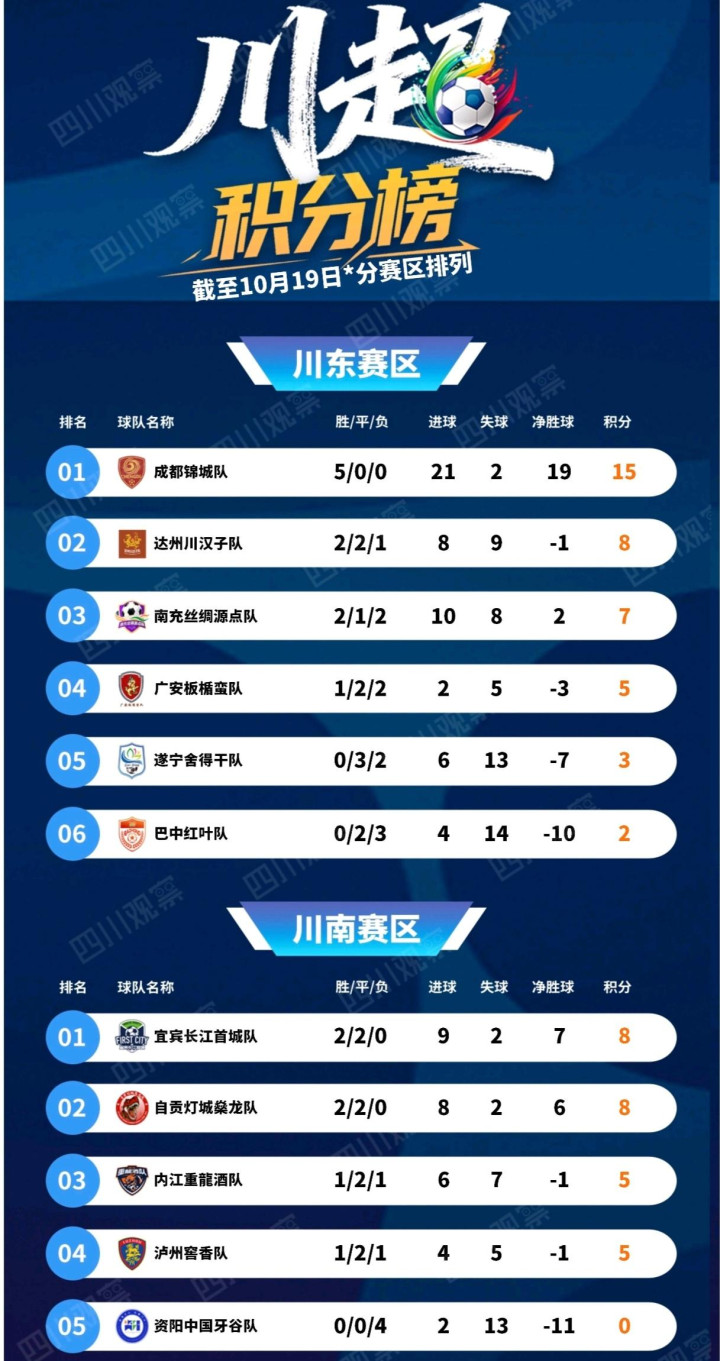 川超最新积分榜: 成都、宜宾、凉山、绵阳位居各自赛区榜首